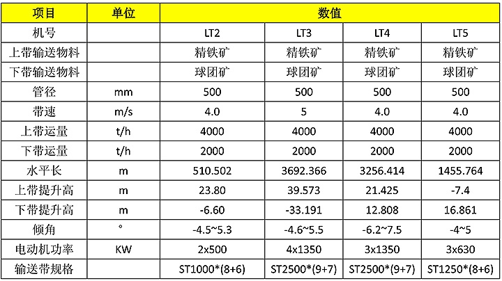 2、该输送系统工艺复杂,四条双向输送管带机相互交接料,上带从码头输送精铁矿至钢厂,下带从钢厂内输送成品球团矿至码头,运行工况十分复杂。
